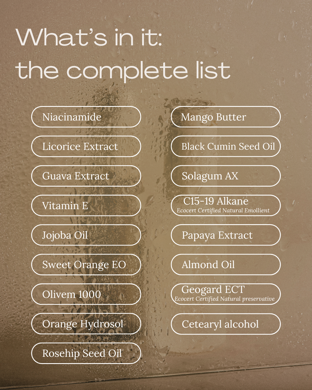 Brightening cream made with 5% Niacinamide, Licorice Extract, Guava Extract and Black Cumin Seed Oil